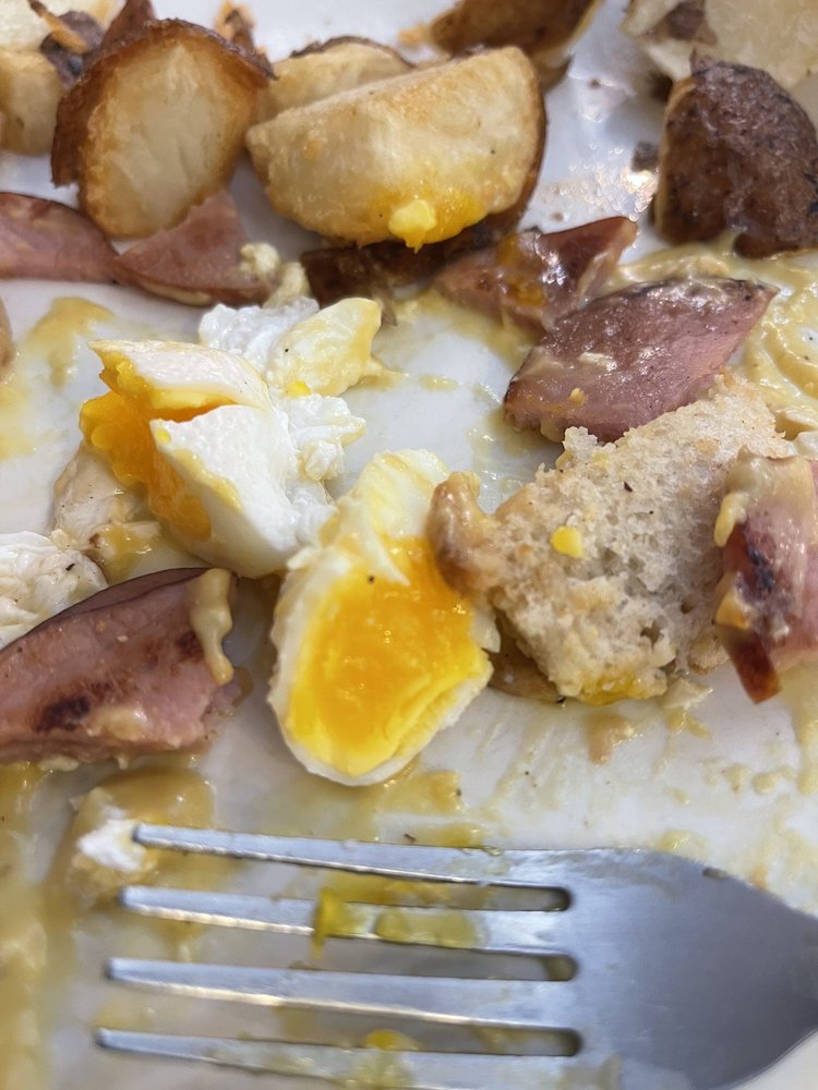 3 eggs, 1 ham, 2 sausage, 2 bacon, homefries, and toast. Consuming raw or undercooked meats, poultry, or eggs may increase your risk of foodborne illness especially if your have certain medical conditions.
